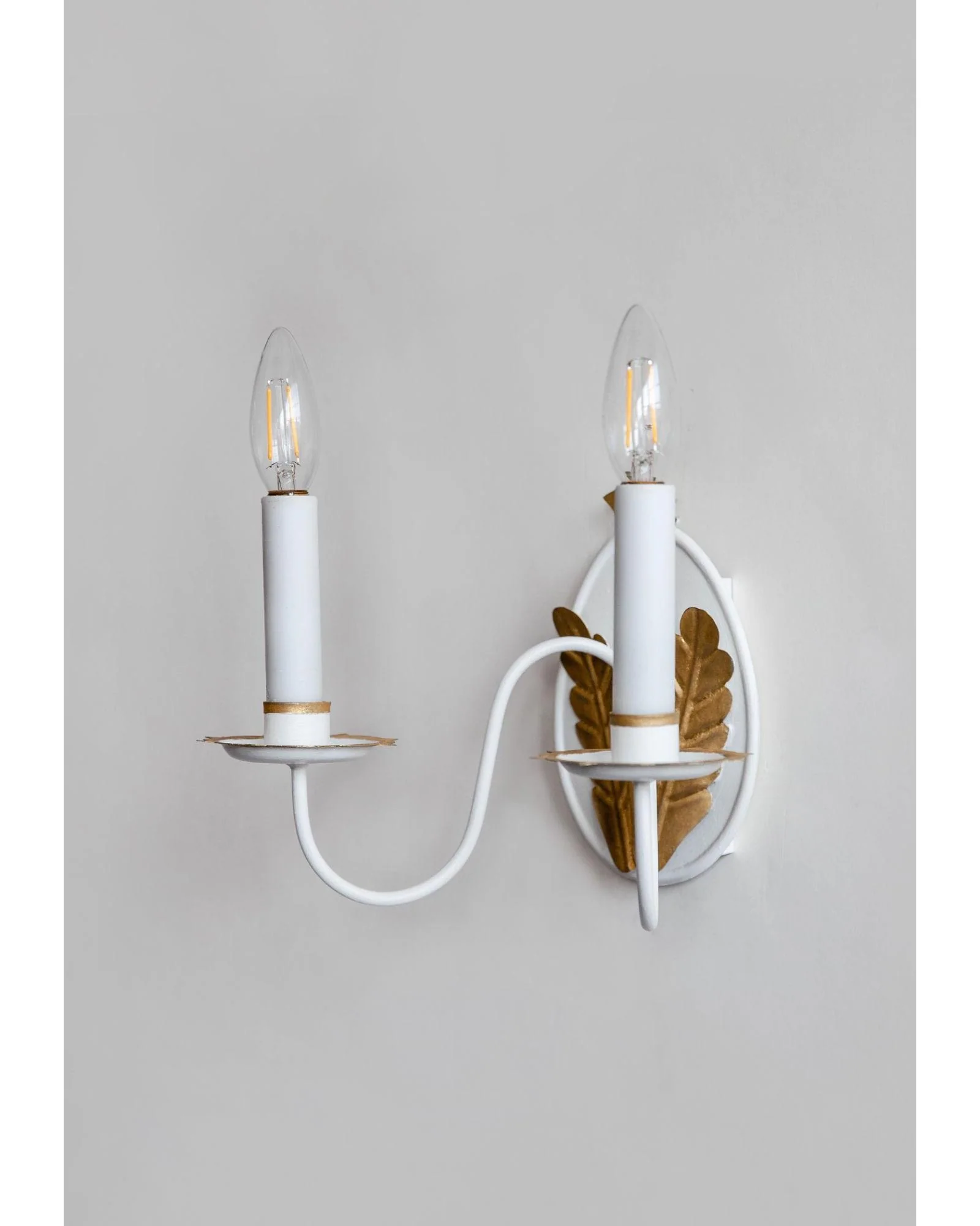 An aged tin double arm sconce with oval backplate featuring 23K gold gilded leaves and top flourish. Designed and manufactured by Scofield Lighting.