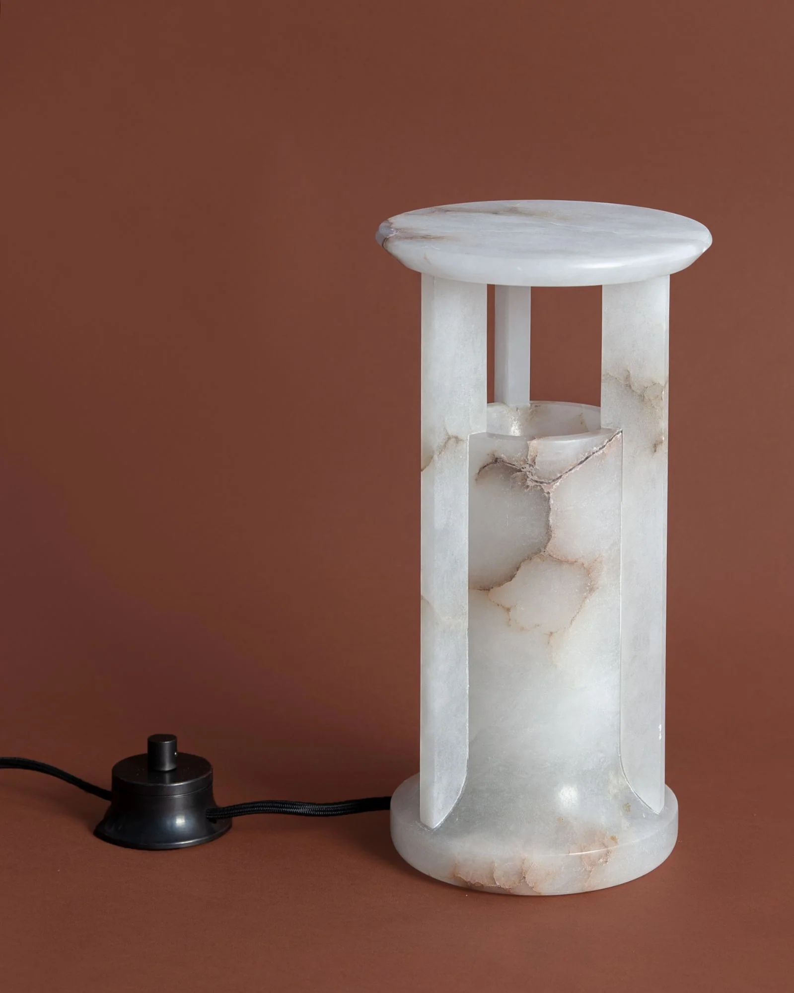 A hand-carved, veined white alabaster table lantern in a tempietto form with a pierced capital, supporting a broad top lens. Fitted with a heavy brass rotary dimming switch and LED lamp that emits a warm glow through the stone body. Inspired by the princess Ariadne of Greek myth. Complete with fabric cord and standard 120v wall plug.
