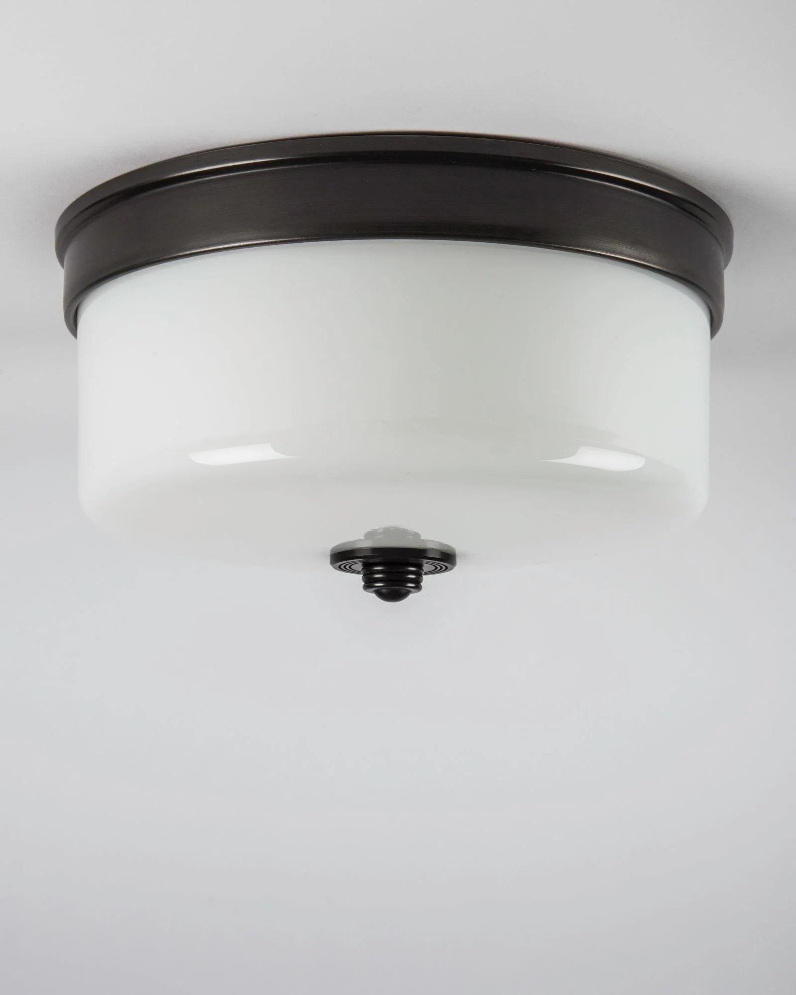 A drum-shaped flush mounted ceiling fixture in solid brass and milk glass. Billie's classic lines are simple yet elegant and suit a wide range of interior styles.