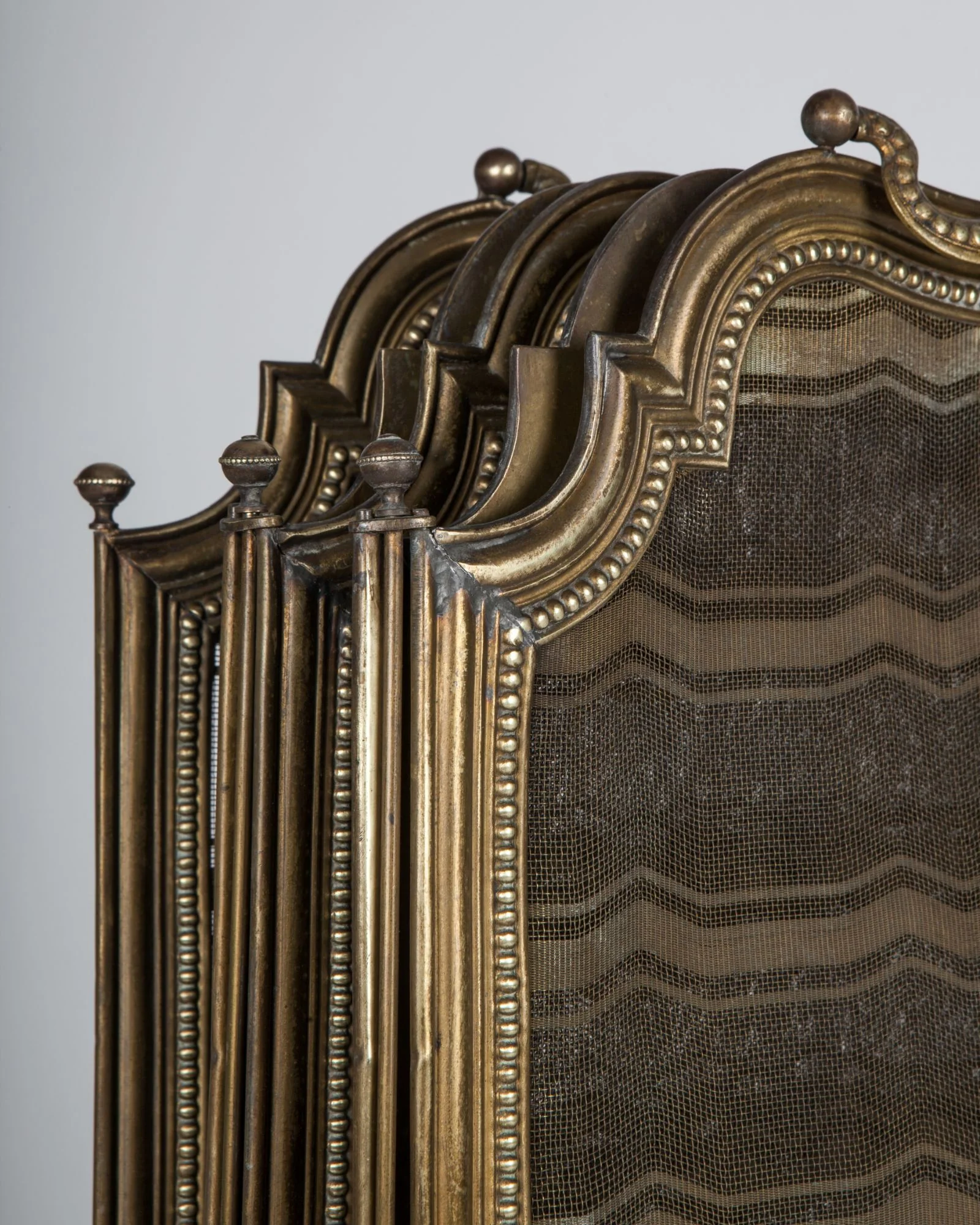 A vintage five panel folding brass fire screen in its original age darkened patina, having horizontal wave-like bands of brass mesh.