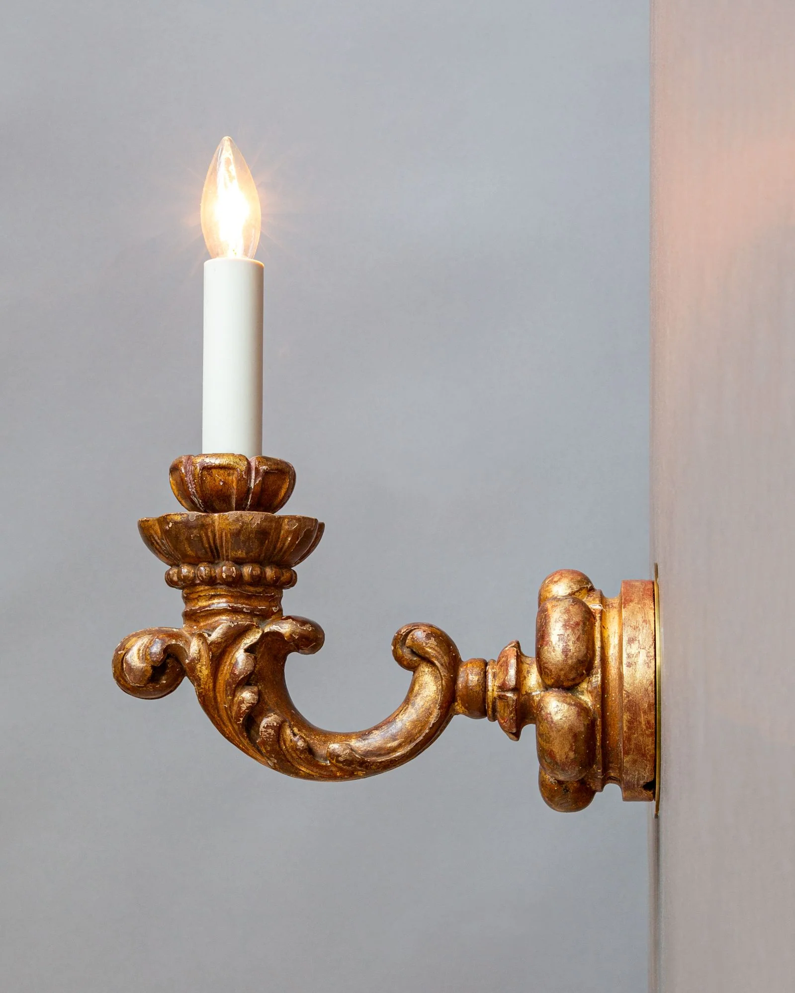 A pair of antique carved wooden sconces with foliate, lobed, and gadrooned details. In their gorgeous original worn gilded finish, now cleaned and preserved. Due to the antique nature of this pair of fixtures, there may be some nicks or imperfections in the wood or variation in form between the pair.