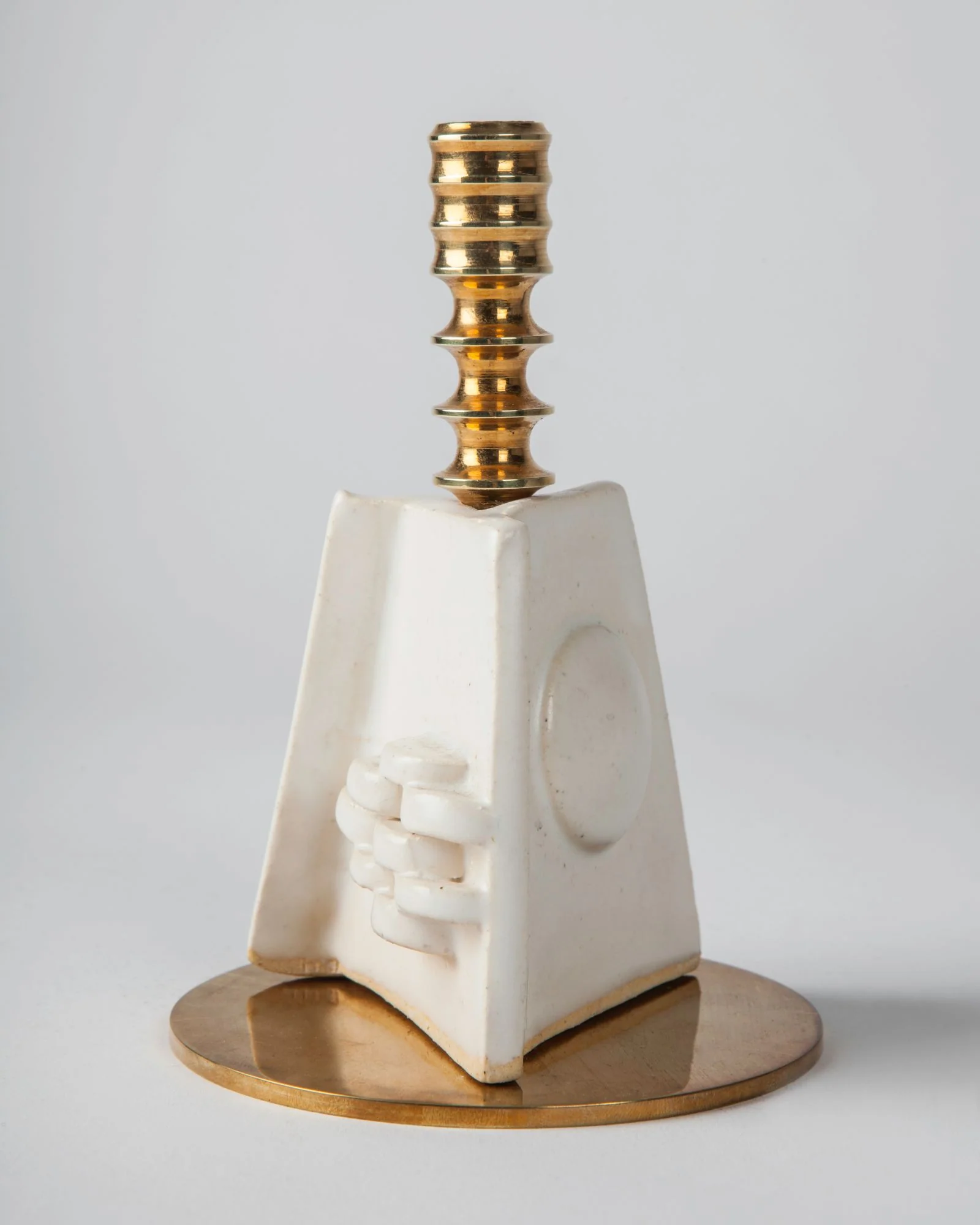 Aged brass and ceramic candlesticks. Each is a unique object having a handmade glazed ceramic body with a hand-turned brass base and candle cup made by Remains Lighting founder David Calligeros. Limited edition in 10 different glaze colors.