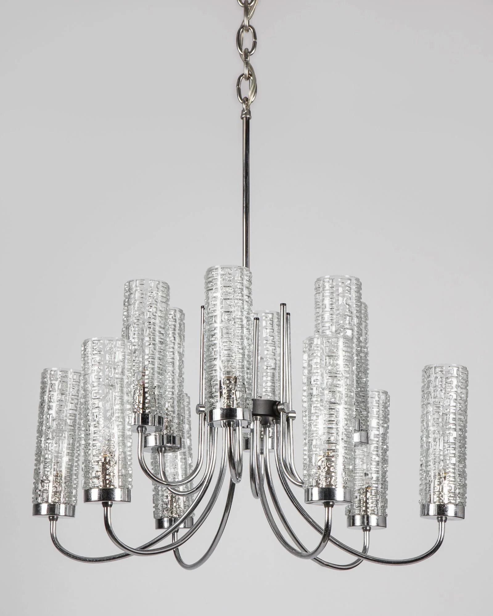 A vintage twelve light chandelier having tall and slender textured glass cylinder lenses with black lacquer and original chrome metalwork. Due to the antique nature of this fixture, there may be some nicks or imperfections in the glass.