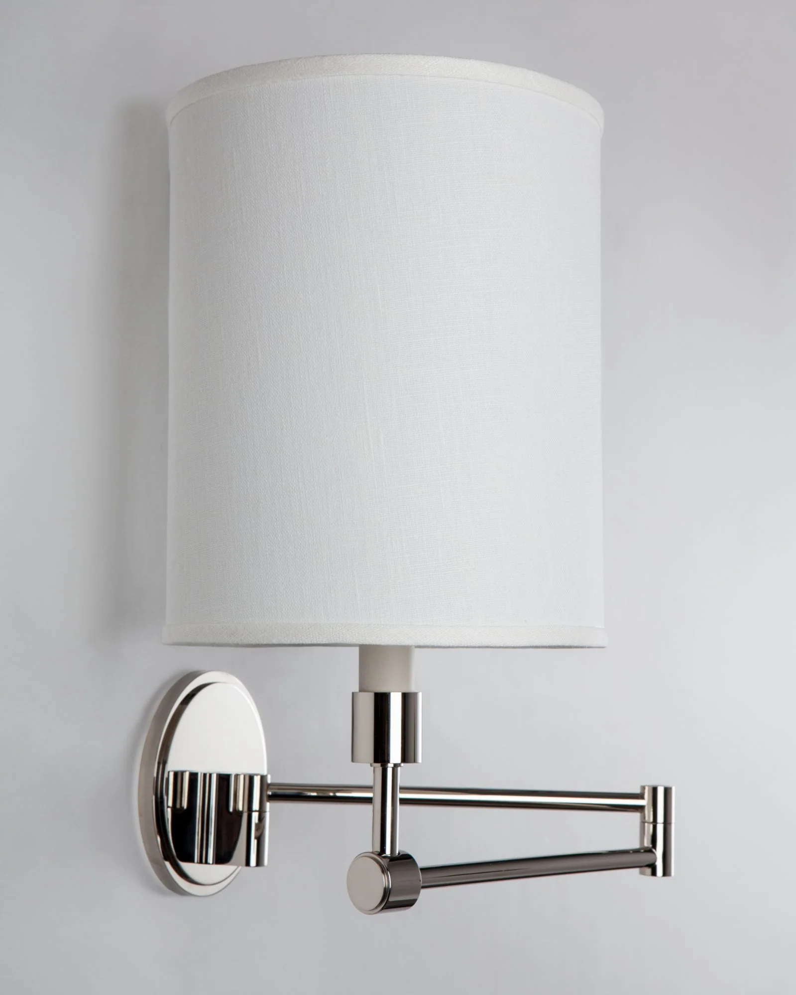 A swing-arm solid brass sconce with stepped round backplate and crisp cylindrical candle cup. Influenced by the sleek all-metal Dornier DO-X flying boat’s powerful and streamlined appearance. Shown with tall linen drum shade.