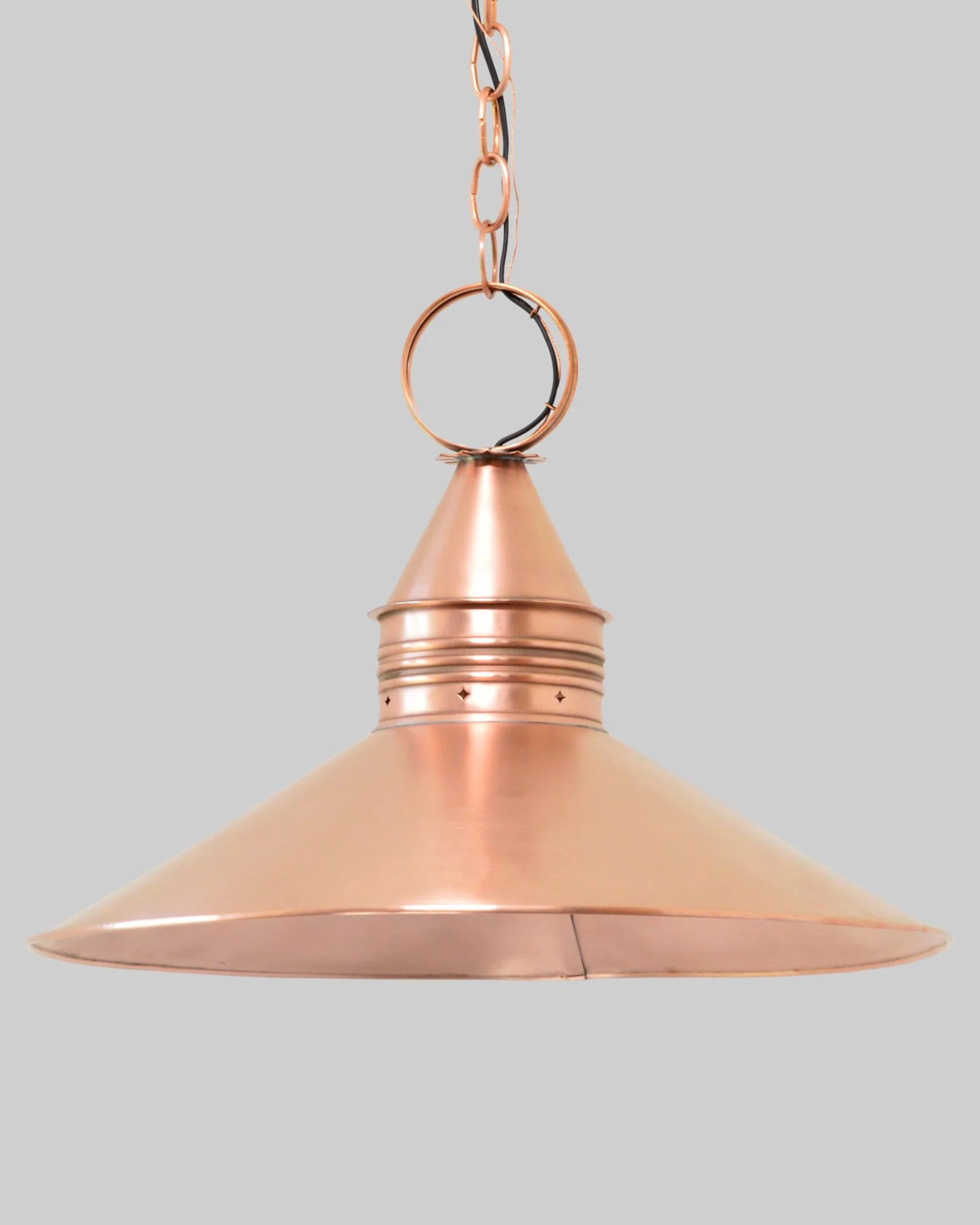 This classic conical shade pendant takes inspiration from the original Victorian Edison type fixture of 1880. With the introduction of the first light bulb in 1879, the world’s fascination with the source of light took on new heights. Aged tin finish provided with off white painted interior. Designed and manufactured by Scofield Lighting.