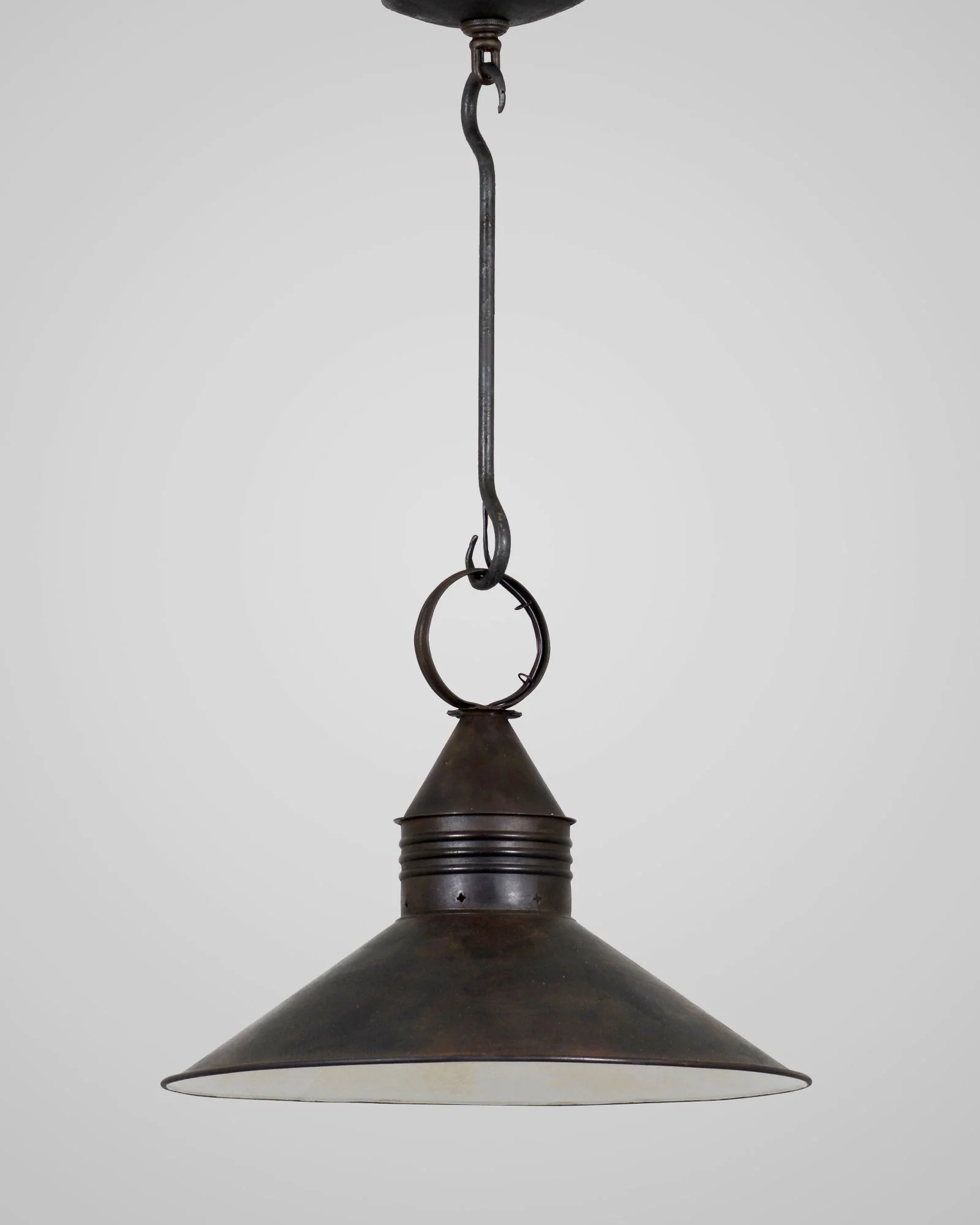 This classic conical shade pendant takes inspiration from the original Victorian Edison type fixture of 1880. With the introduction of the first light bulb in 1879, the world’s fascination with the source of light took on new heights. Aged tin finish provided with off white painted interior. Designed and manufactured by Scofield Lighting.