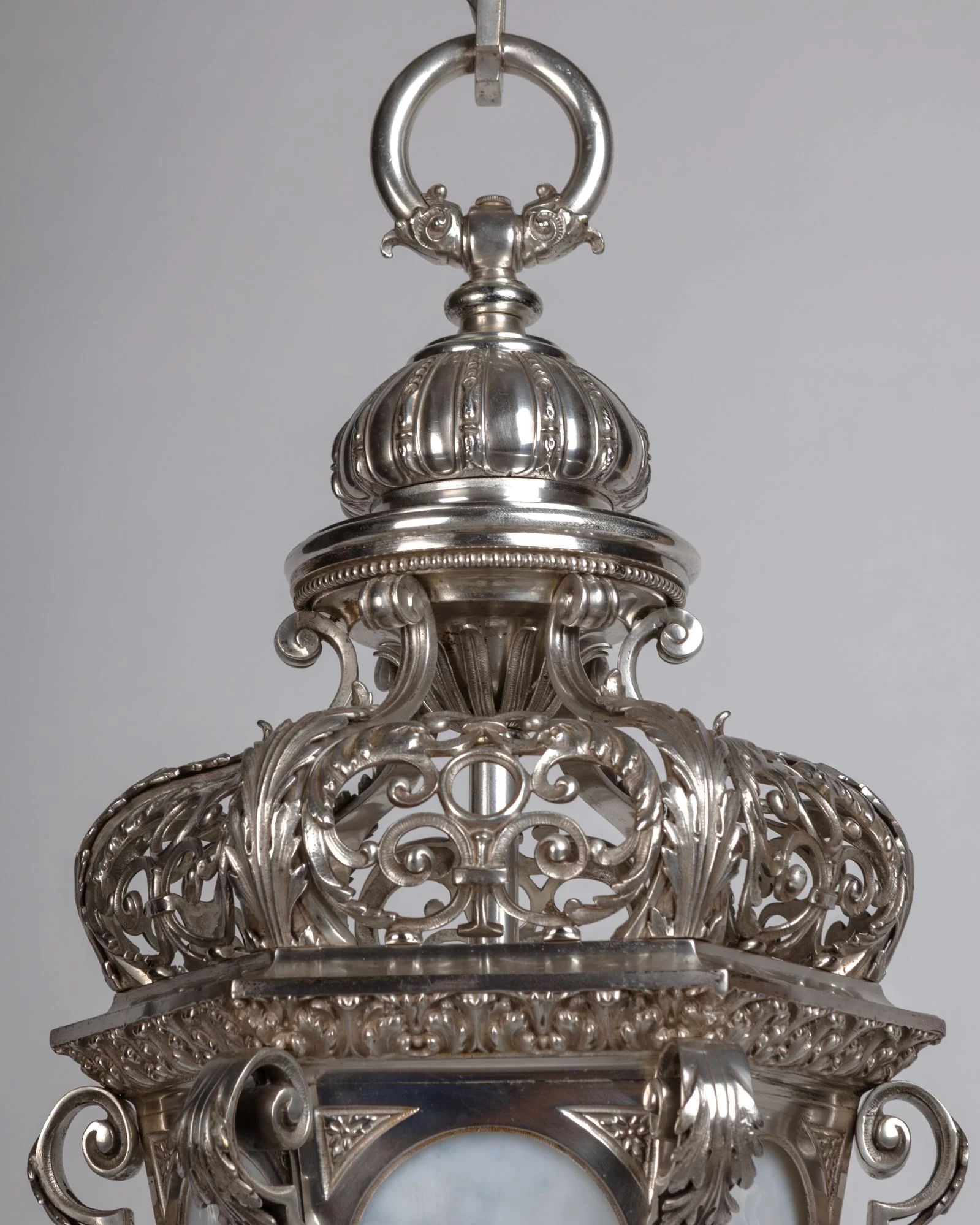 A hexagonal lantern with intricate foliate elements of cast bronze, the detail in the castings, especially the openwork crown, is very fine. Finished in its original aged silverplate and set with textured opaline glass panels. Due to the antique nature of this fixture, there may be some nicks or imperfections in the glass.