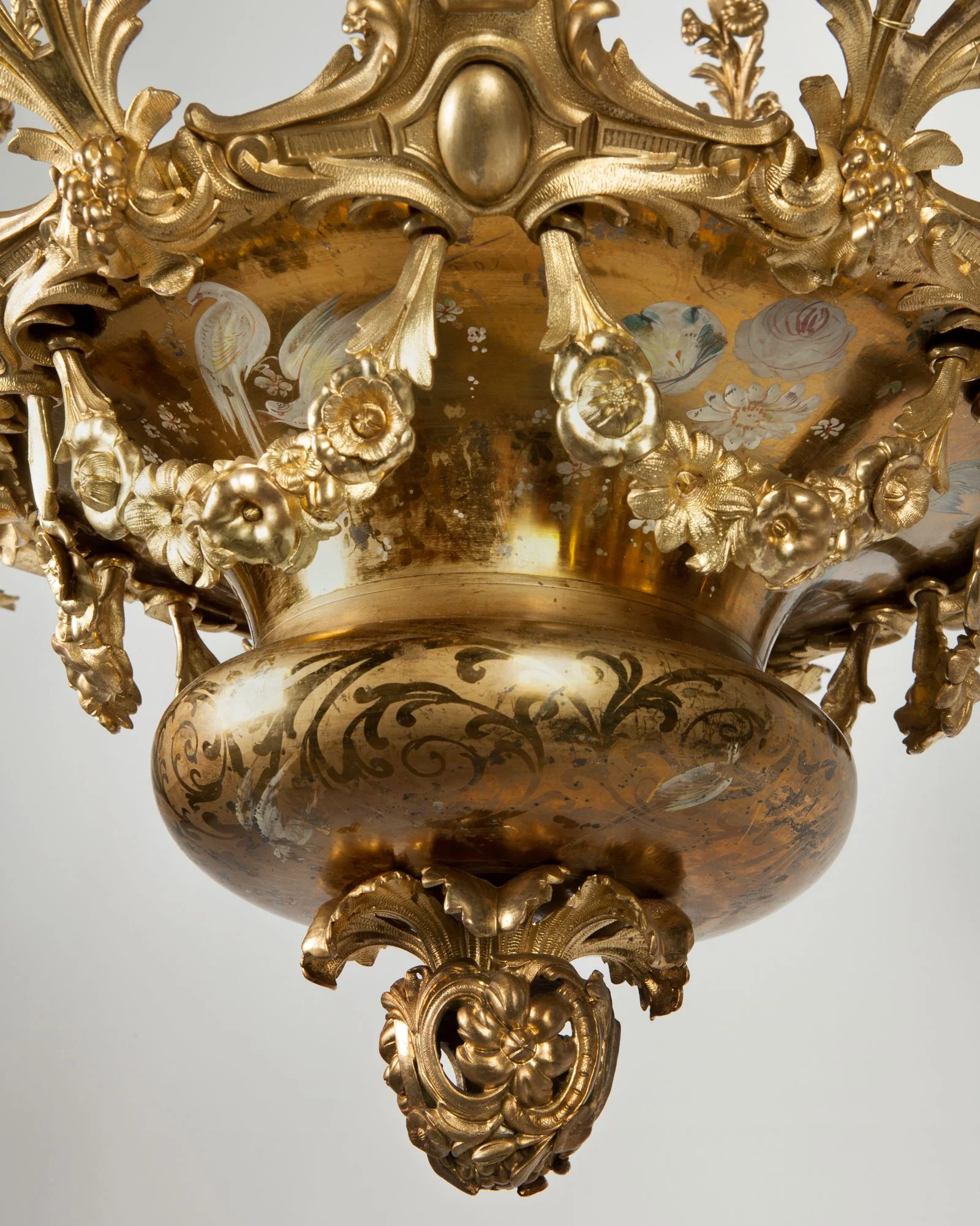 A vintage twelve light chandelier which retains its original gilded finish, enlivened by arabesques in bright and matte patterns native to the gilding, as well as polychrome foliate and aviary scenes. The fixture takes the form of a large dish with radiating pairs of leafy double arms; between them span foliate garlands. Chain links in a similar pattern suspend the body from a garlanded canopy. The balanced and well-proportioned assemblage is of the highest quality in casting, chasing, and surface.