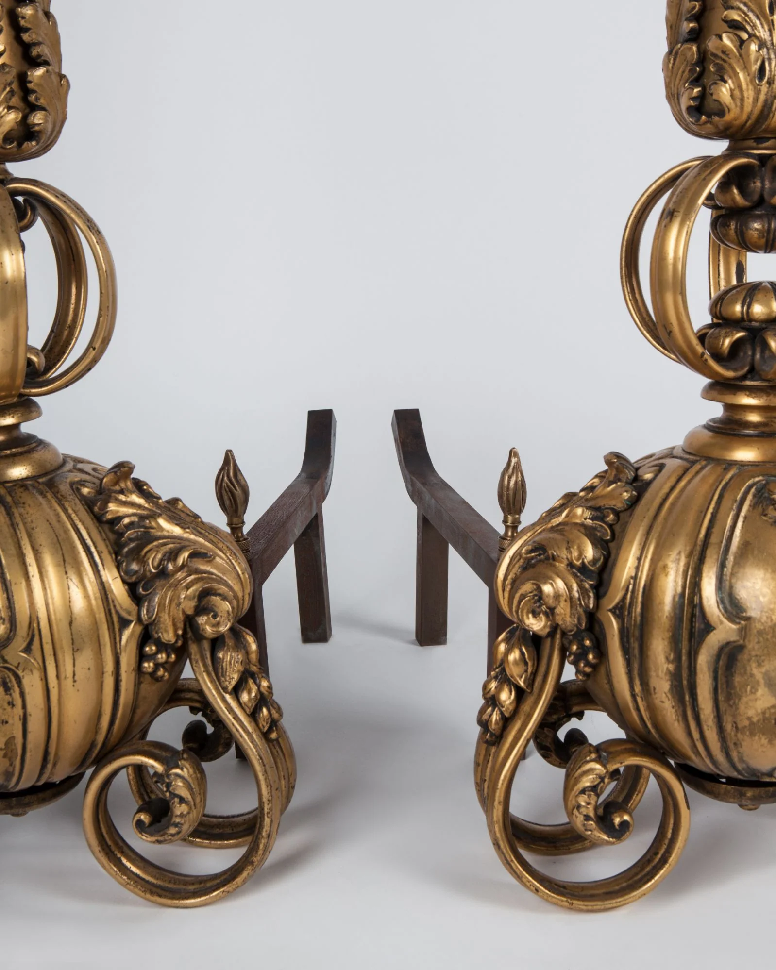 A pair of gilded bronze andirons supported on foliate-form double-S scrolls. The torch finials are held over the bases on a basket of C-curves. Attributed to the New York maker Sterling Bronze Co.