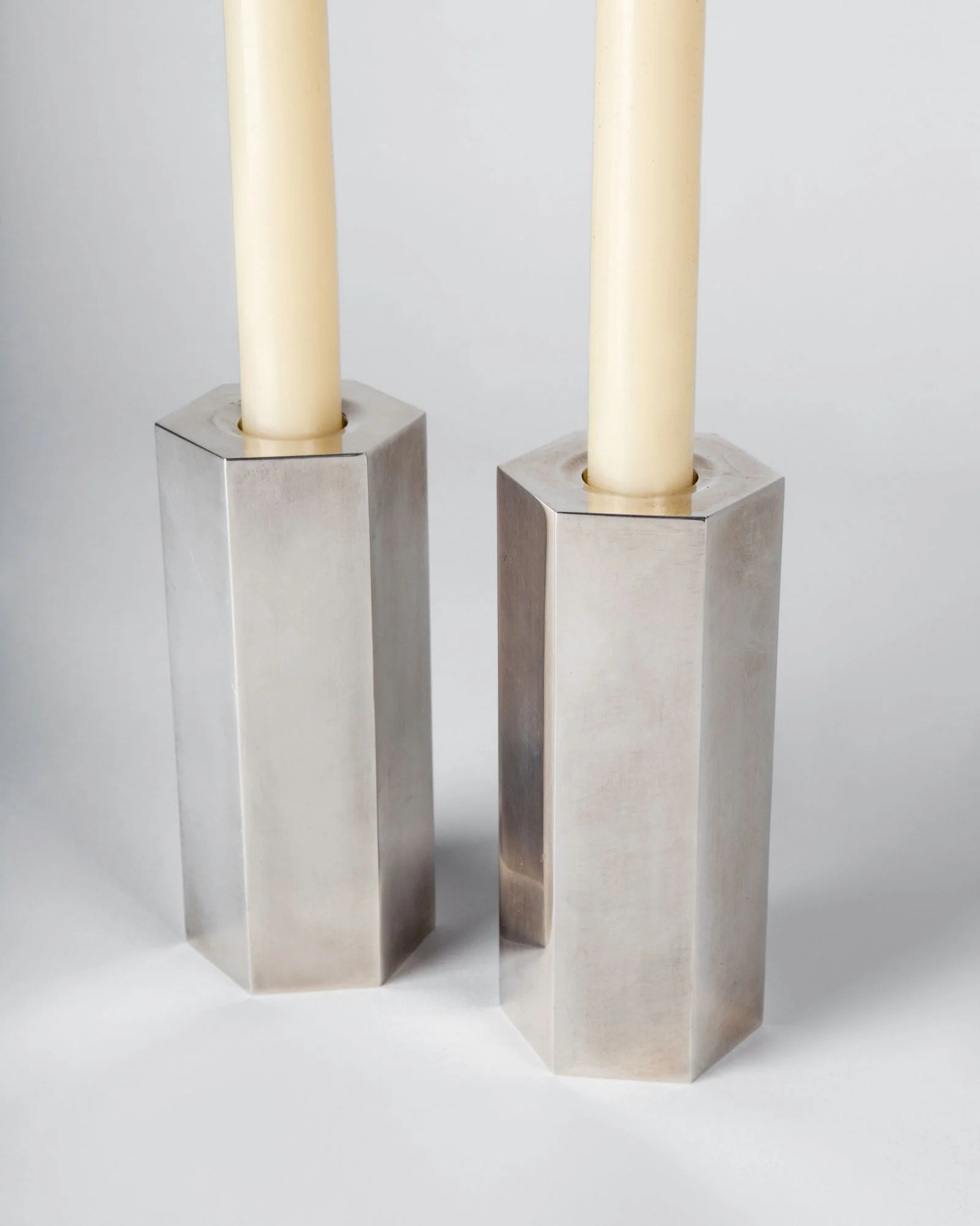 A solid brass hexagonal form candlestick, which reflects light from its many sides. Part of our set of universal geometric building blocks.