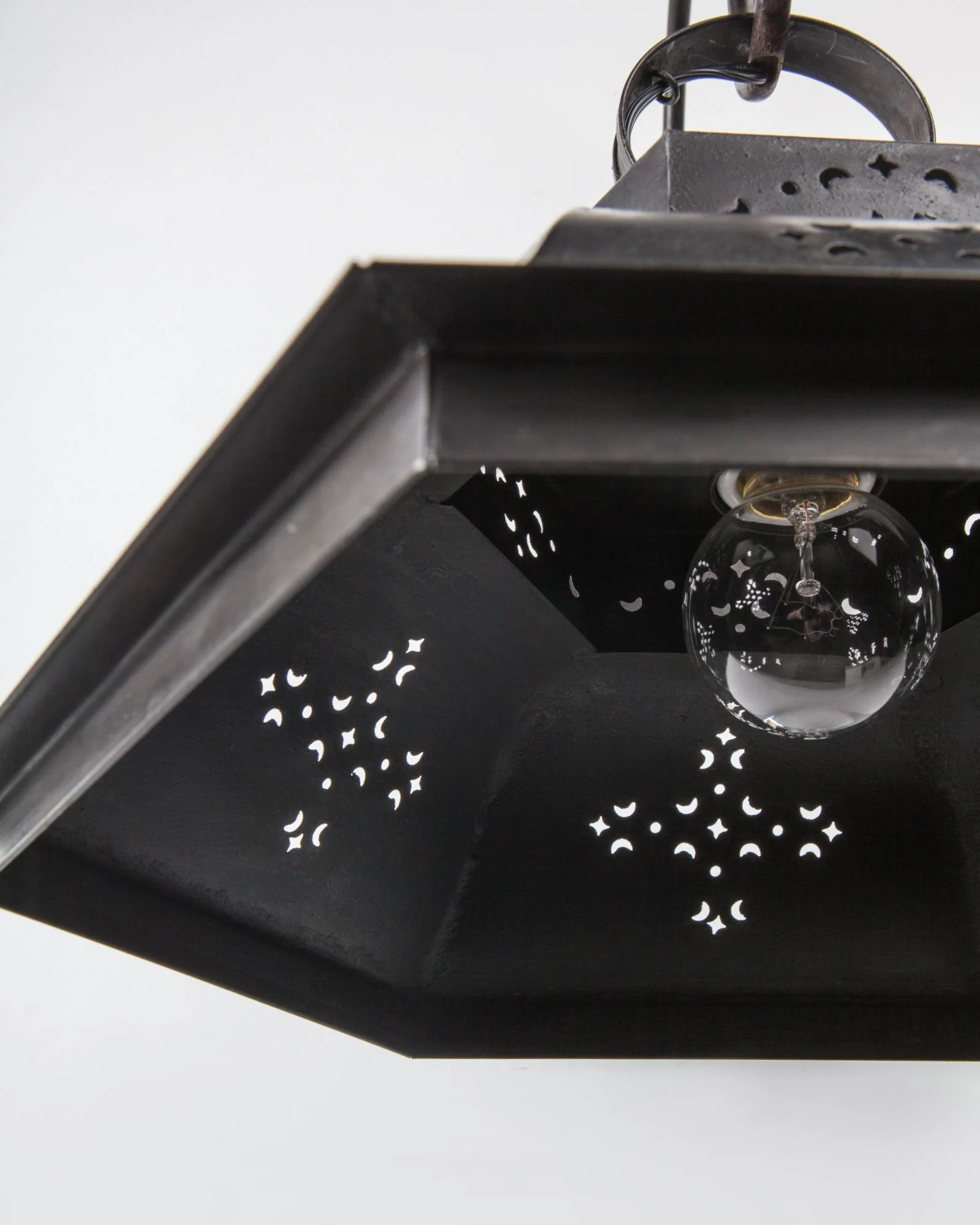 A stepped and curved paneled hexagonal wall pendant light in copper or tin with decorative punch work. Inspired by European 18th - 19th century pendants. Designed and manufactured by Scofield Lighting.