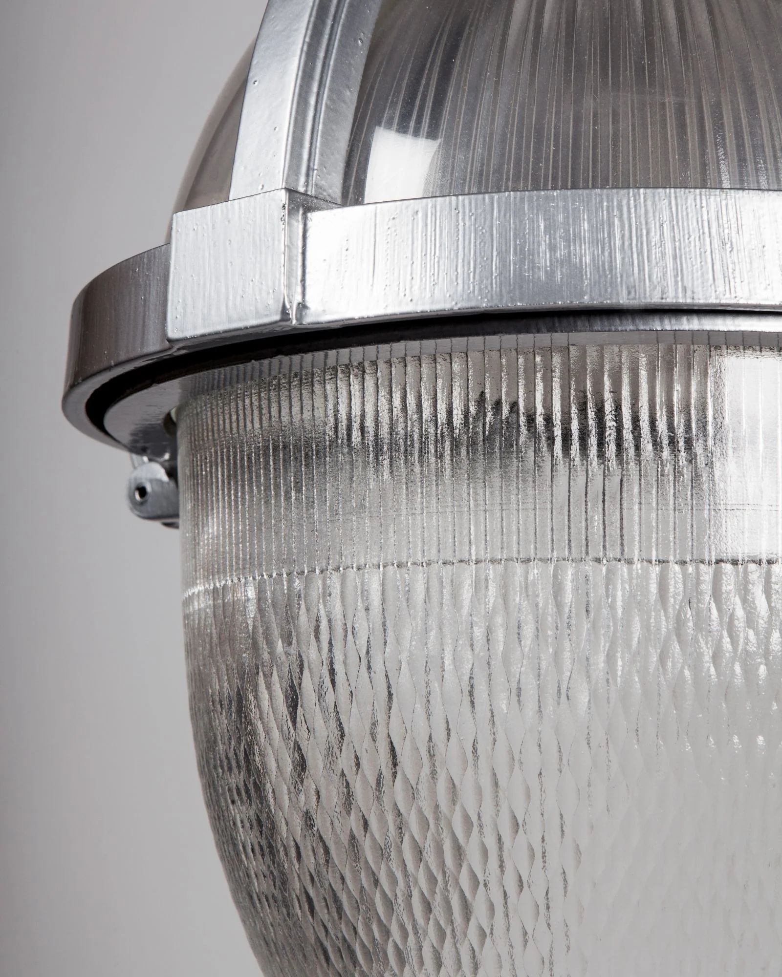 A vintage industrial lantern having a two-part bullet shaped holophane glass lens and acrylic top cover in a cast aluminum frame and body, all in its original silver powdercoat finish. The body is suspended on polished nickel metalwork made in the Remains Lighting Co. workshop. Due to the antique nature of this fixture, there may be some nicks or imperfections in the glass as well as variations from piece to piece.