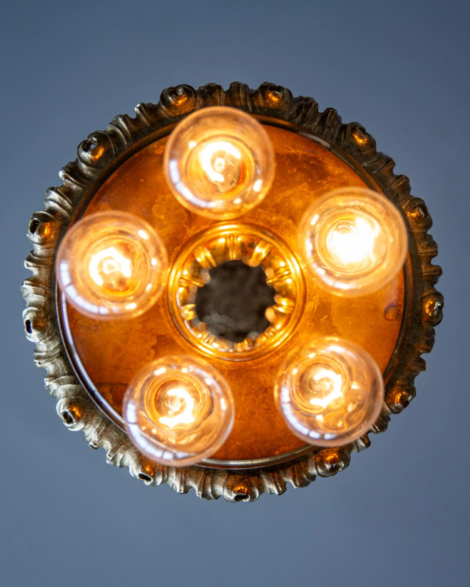 An antique pendant fixture with a tray of clear lamps in a warm brass frame detailed with acanthus leaves, beading, and a tassel finial.