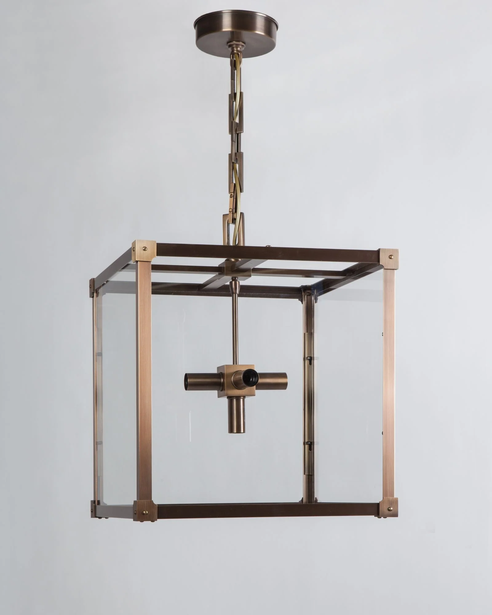 A solid brass and glass four square hanging lantern comprised of sleek legs joined by sharp jewelry-cast corners with clean, expressed domed fasteners. Glazed with clear glass panels.