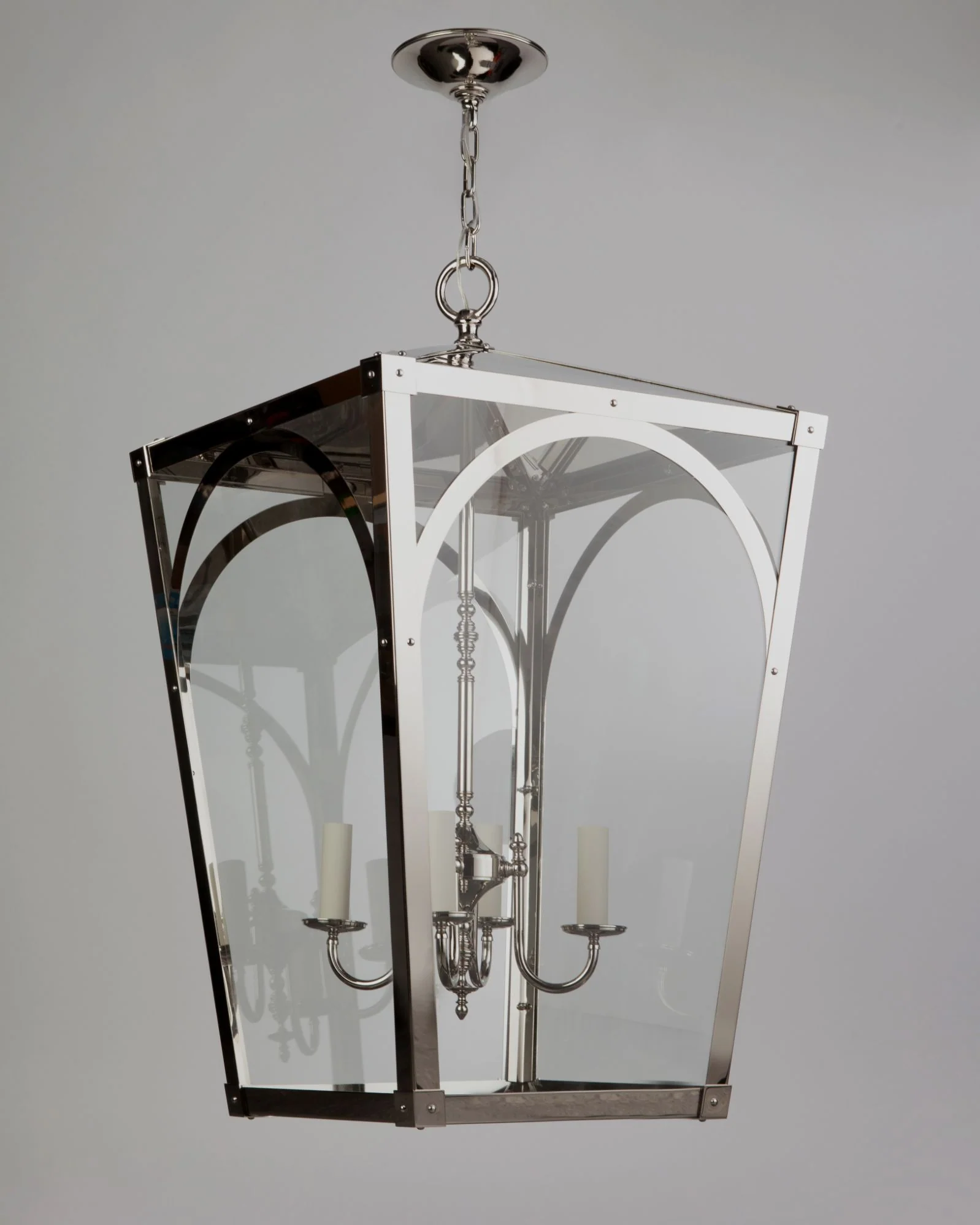 A tapered four-sided solid brass and glass hanging lantern with arch-detailed panels and clean expressed joinery. Inspired by stable windows seen in the Pennsylvania countryside.