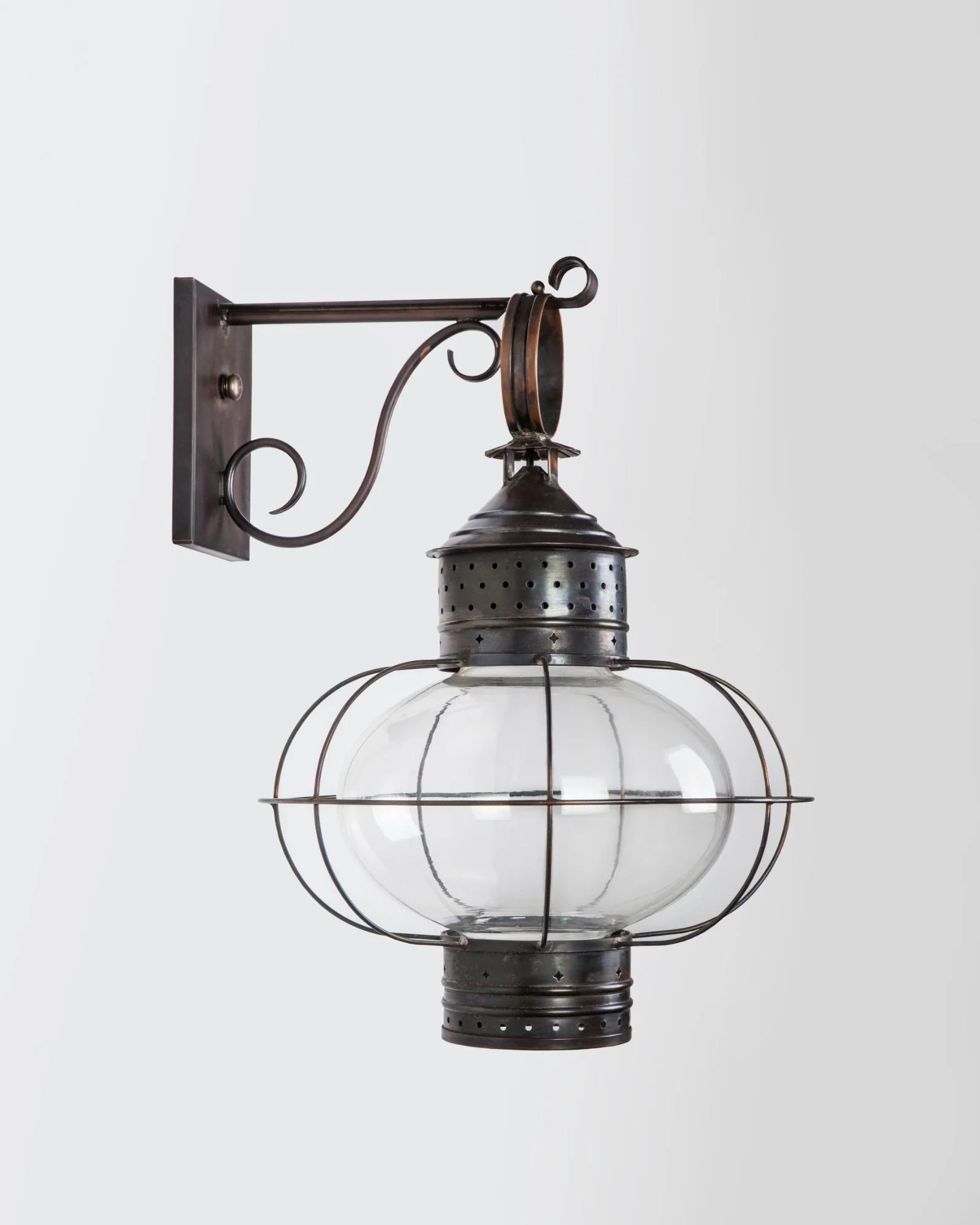 A copper wire caged hand blown "onion" glass wall lantern with punchwork decorated cylinders above and below the globe. This type of lantern was originally fueled by whale oil and was frequently associated with maritime use. New England, circa 1830. Designed and manufactured by Scofield Lighting.