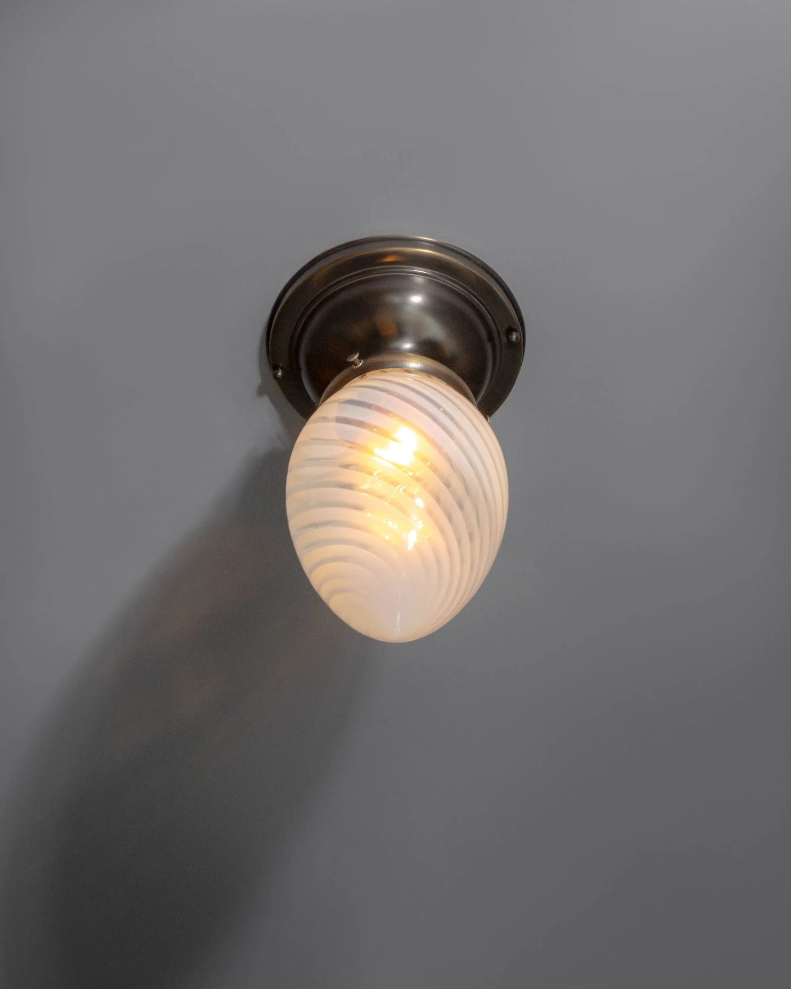A simple flush-mounted ceiling fixture with antique metalwork in a dark patina and a contemporary hand-blown swirled opalescent shade.