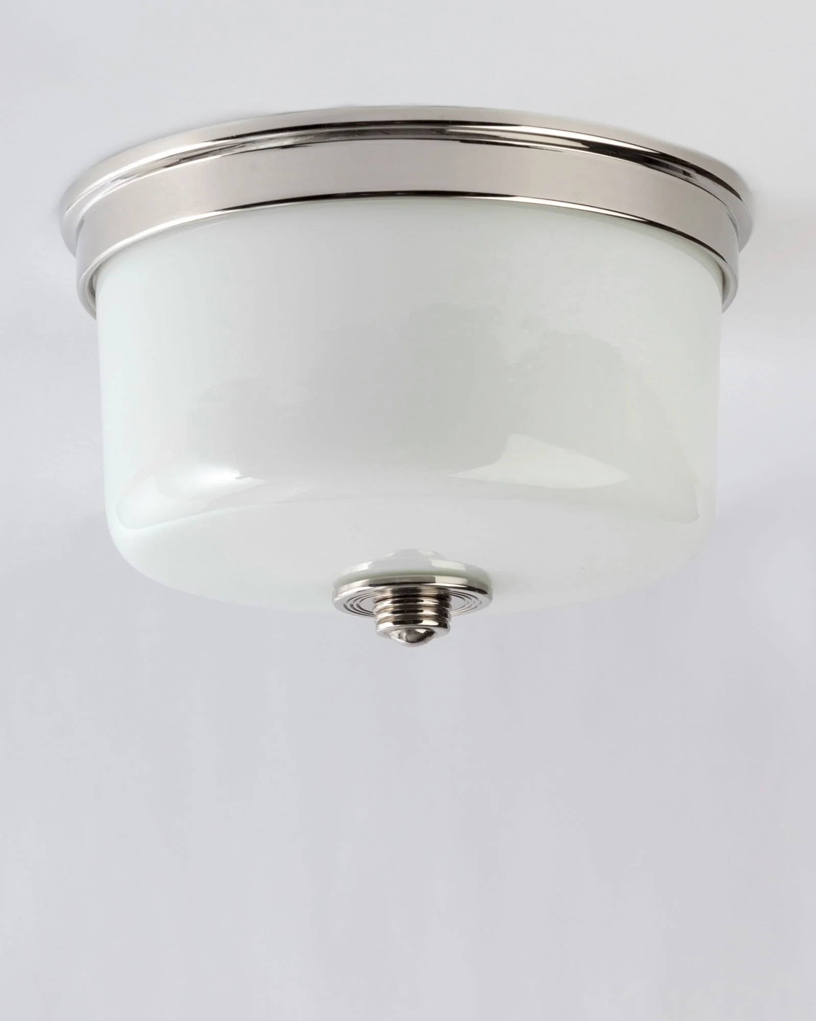 A drum-shaped flush mounted ceiling fixture in solid brass and milk glass. Piet's classic lines are simple yet elegant and suit a wide range of interior styles.