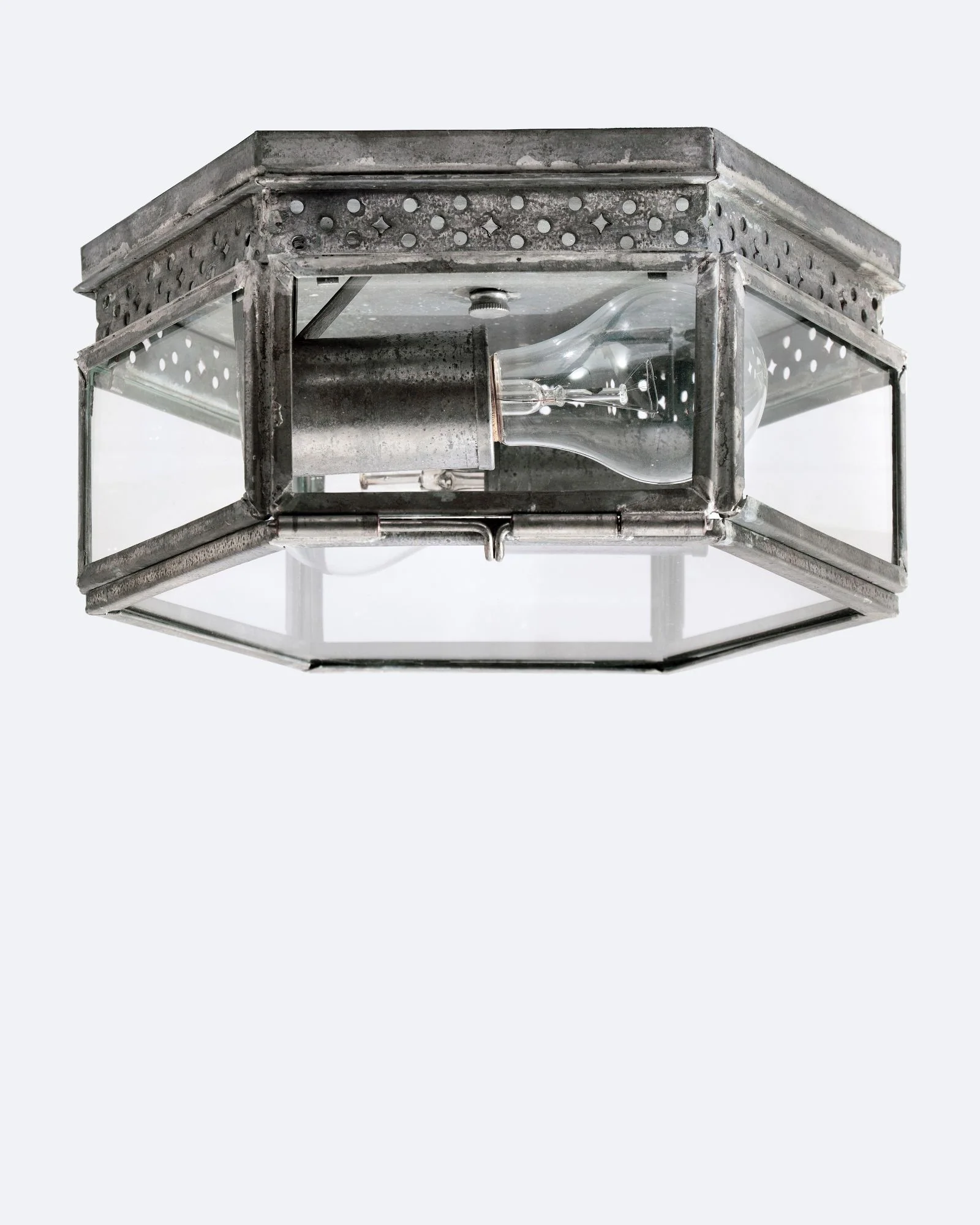 Ceiling mount hexagon light with rectangular windows and decorative punch work. Designed and manufactured by Scofield Lighting.