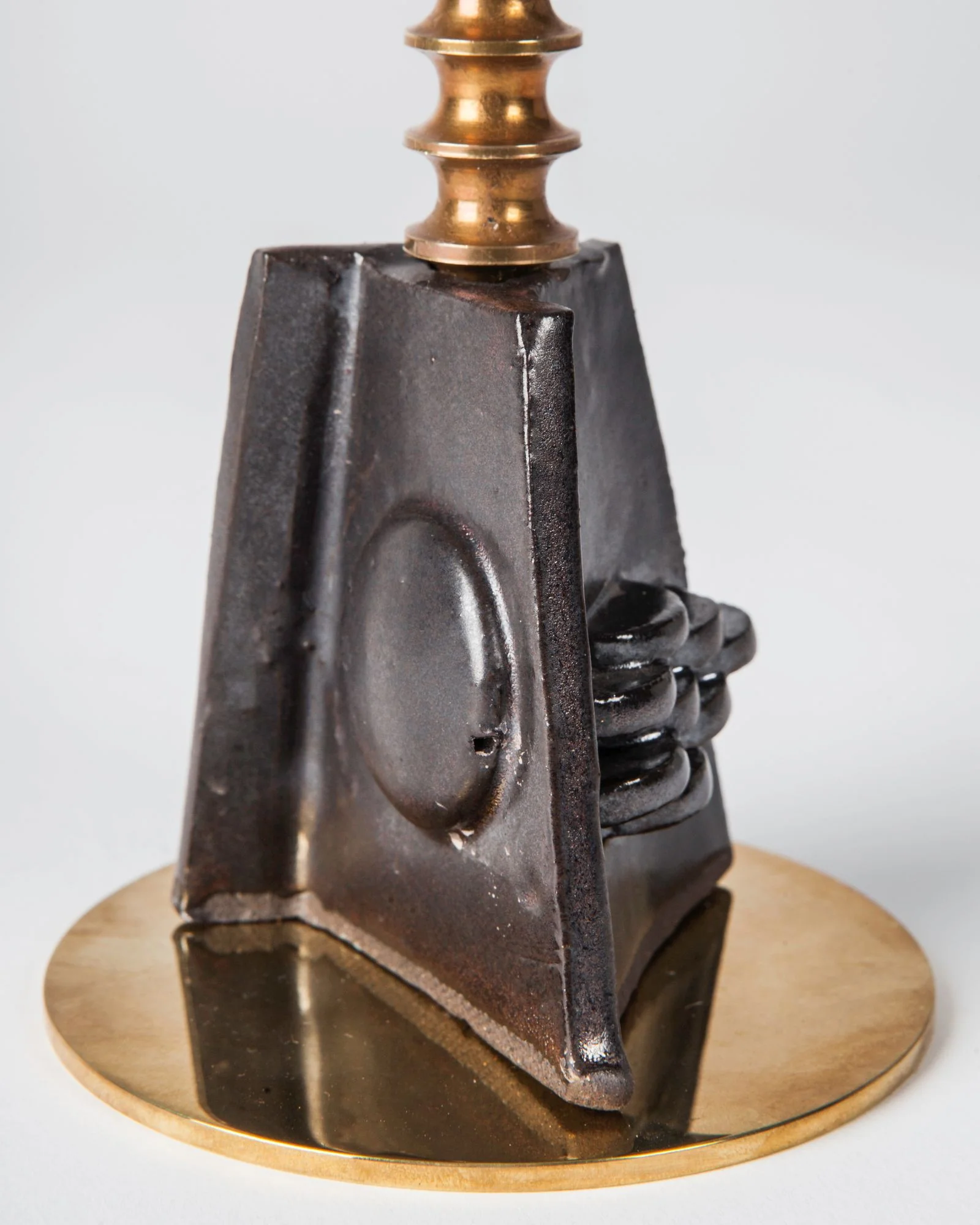 Aged brass and ceramic candlesticks. Each is a unique object having a handmade glazed ceramic body with a hand-turned brass base and candle cup made by Remains Lighting founder David Calligeros. Limited edition in 10 different glaze colors.