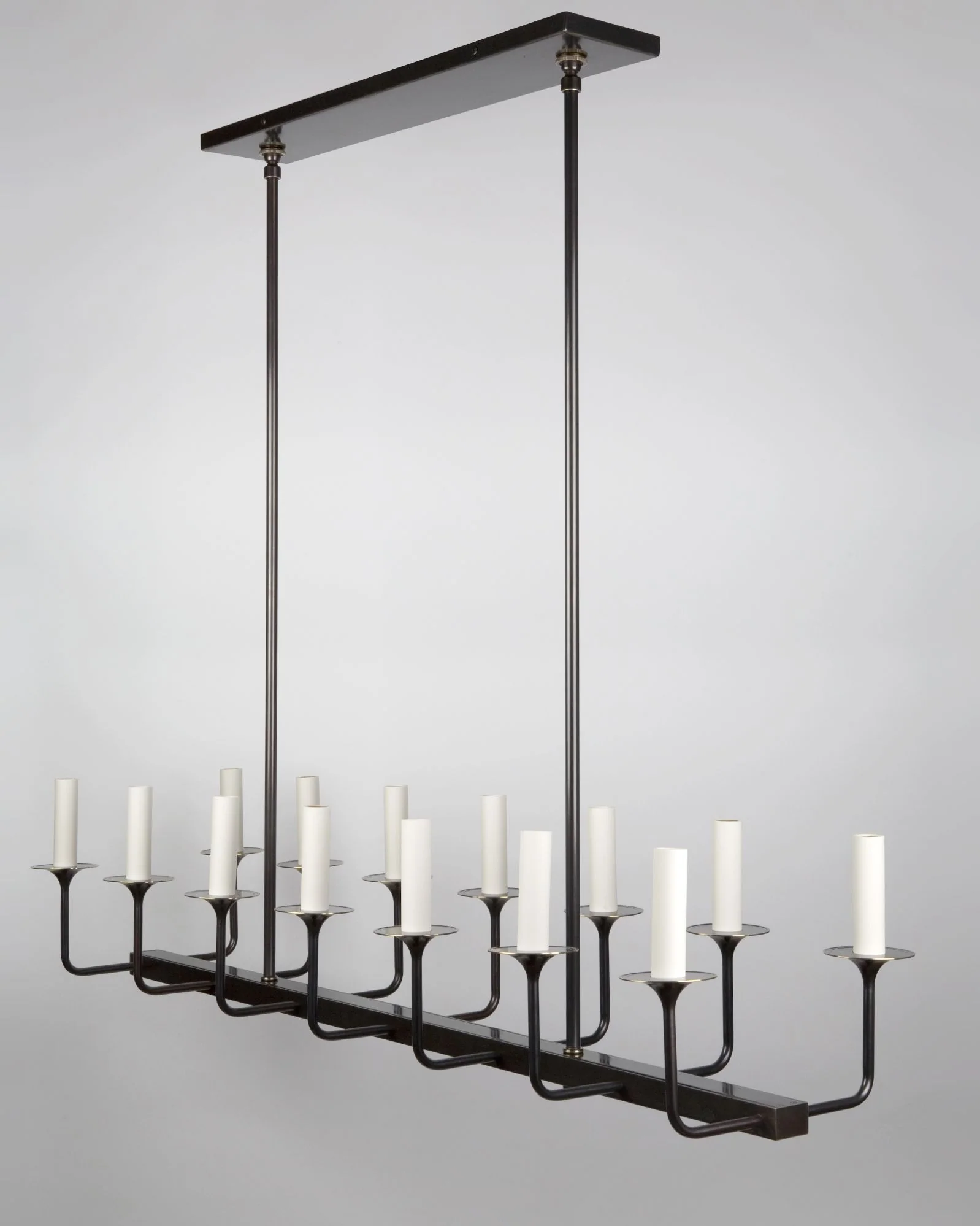 A solid brass fourteen-light chandelier in the French Moderne style; its graceful arms run the length of a solid central bar that is suspended from a long, low-profile ceiling canopy. Designed by Steven Sclaroff.