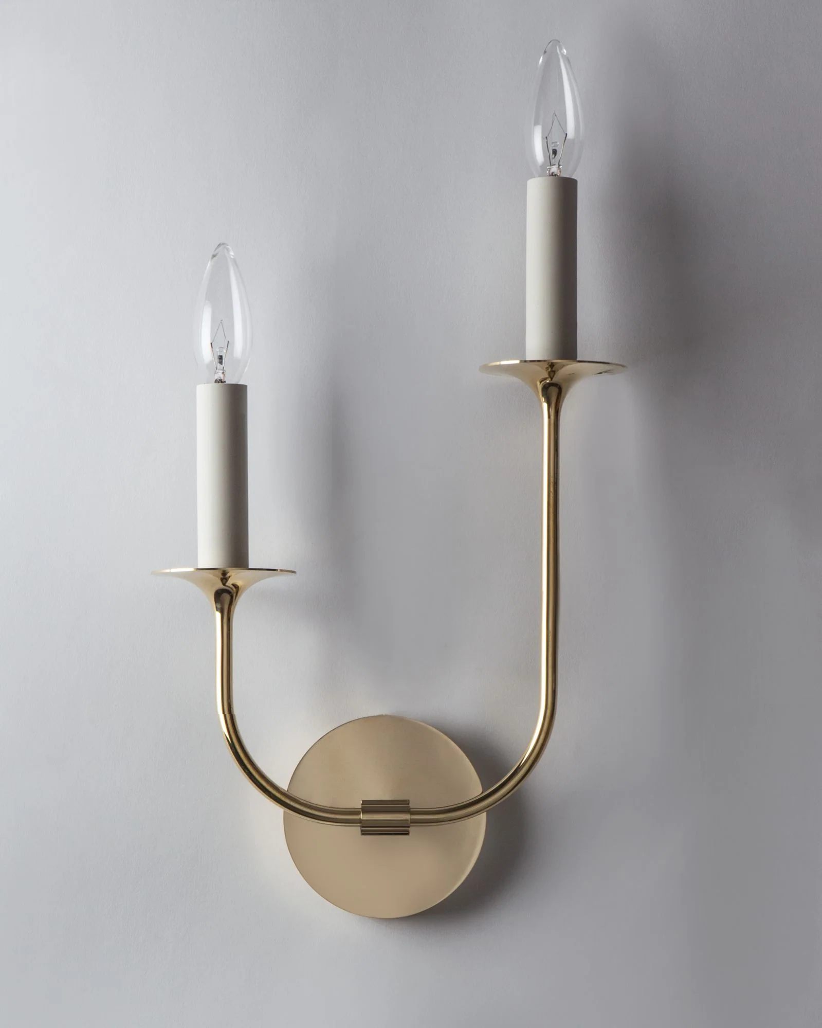 A double light solid brass sconce with crisp circular backplate and two uneven height slim arms which flare into the bell of the candle cups. Inspired by classic French Moderne designs, the Veronique family embraces pure, sleek, simple forms. Often used as a left and right facing pair.